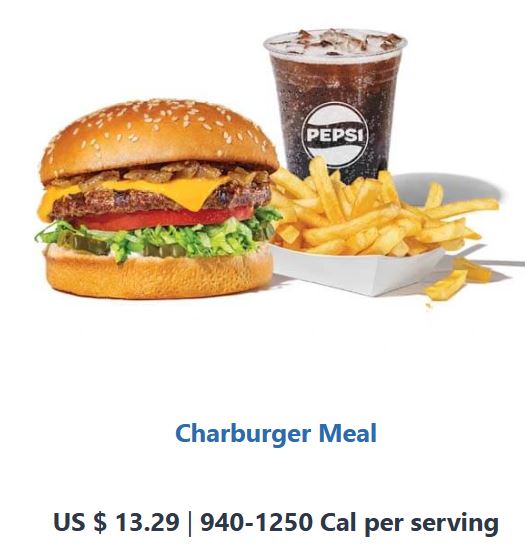 | Charburger Meal | $13.29 | 940–1250 Calories |