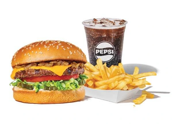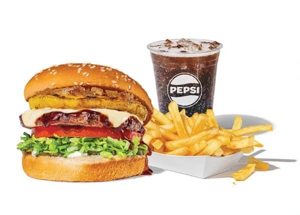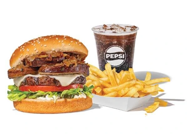 This meal is served with crispy fries and a drink, making it a complete and satisfying combo. It’s a popular choice for customers who enjoy stronger, more indulgent flavors, offering a hearty burger experience with a balance of smokiness, sweetness, and classic flame-grilled taste.