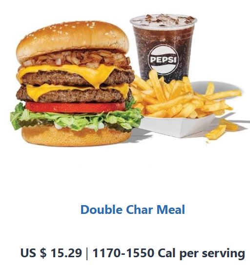 | Double Char Meal | $15.29 | 1170–1550 Calories |