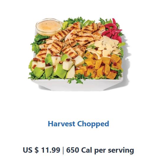 - Harvest Chopped Salad – around $12 | ~650 calories
