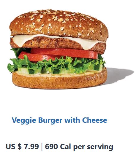 | Veggie Burger with Cheese | $7.99 | 690 Calories |